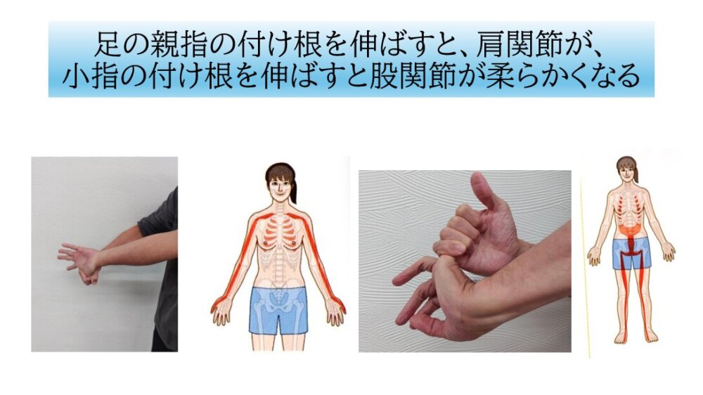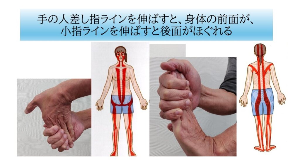 開いた側の手の親指から順番に、上の写真の経絡治療をして腸腰筋が緩んだのを確かめてからから