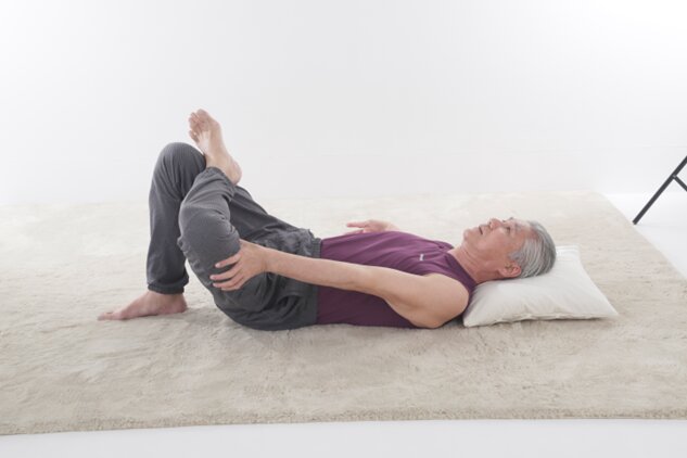 こうやって朝に腸腰筋をほぐしてから起きると、便通も快適になる。